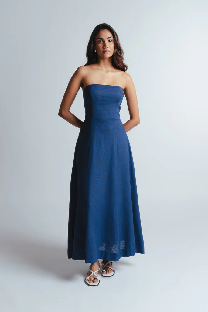 This Royal Strapless Midi dress features a fitted silhouette with a flattering square neckline and easy back zip closure for a sleek look. Crafted from a breathable linen blend, it offers both comfort and durability. Practical pockets on both sides add convenience without compromising style. Made in India with attention to detail, this dress seamlessly combines elegance and functionality for sophisticated occasions.